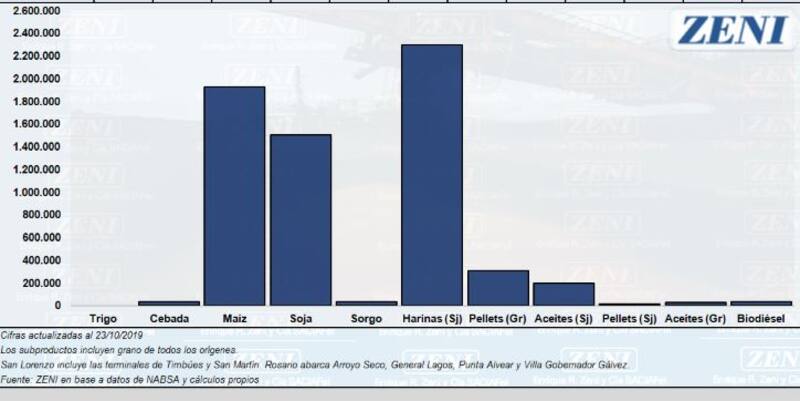También hay a la carga o cargando, 1,92 millón de toneladas de maíz, por u$s 301 millones;1,5 millón de soja sin procesar, por u$s 534 millones.
