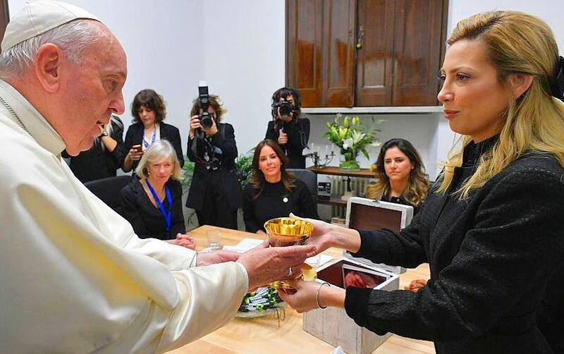 “Santo Padre, le envían de Argentina el cáliz de la misa por la unión de los argentinos que se celebró en la Basílica de Luján y que significó tanto para nuestro país , expresó Yáñez al Papa, quien le agradeció el gesto y la abrazó.