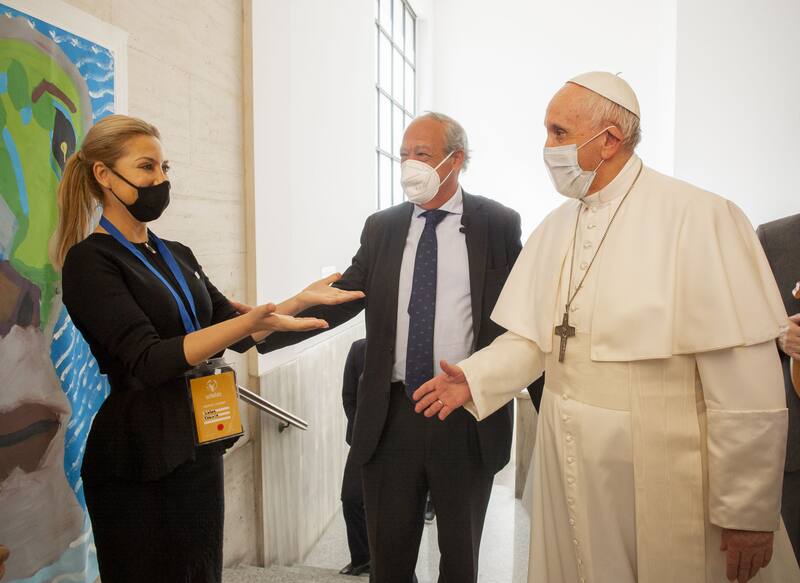 Fabiola Yáñez, al realizar la acción, le expresó al Papa Francisco: "Querido Santo Padre, para mí es un gran honor, una gran alegría, poder estar presente aquí hoy en representación de todas mis colegas de Latinoamérica y también este gesto con el que voy a comenzar, es un gesto que significa que desde la creatividad, desde este muevo renacer, podamos construir unión, solidaridad y sobre todo que nos sanemos emocionalmente todas la personas del mundo. Primero pido por mi país porque es algo que necesitamos, necesitamos estar unidos porque como hemos dicho ya, nadie se salva solo".