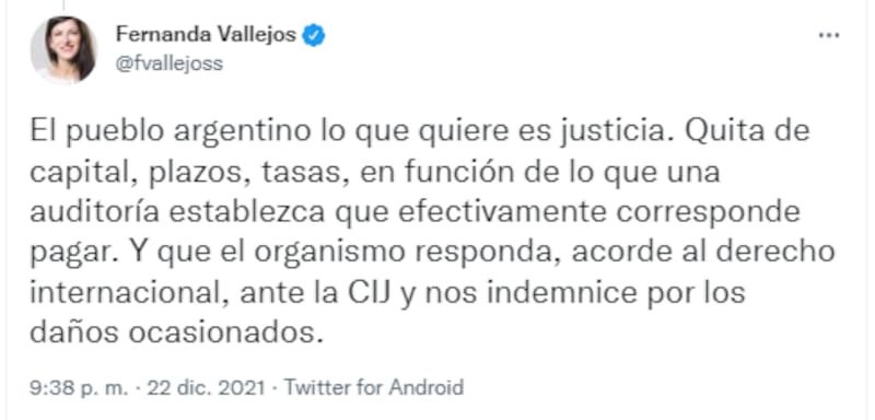 "El pueblo argentino está reclamando justicia. El FMI debe reparar, indemnizar a la Argentina por los daños generados", sentenció Vallejos.