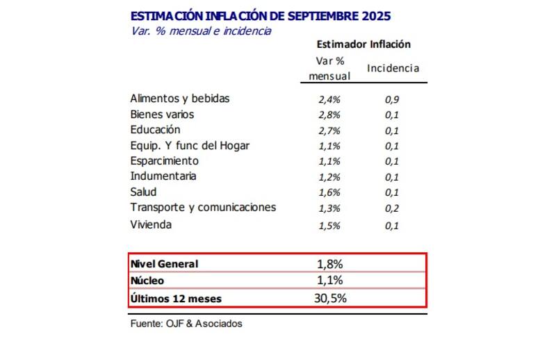 Con este escenario de fondo, el informe reveló el dato central. "De acuerdo con el IPC-OJF (GBA), la inflación de septiembre fue de 1,8% mensual y mostró un crecimiento interanual de 30,5%", indica la consultora.