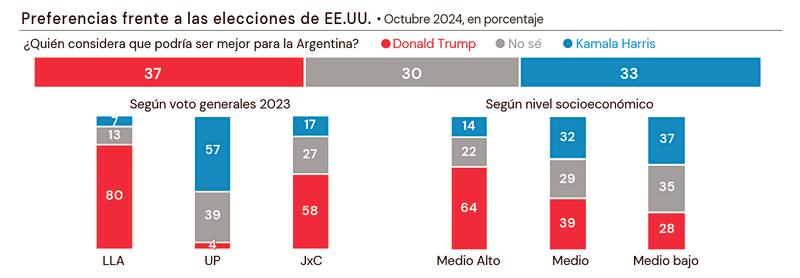 Para este último punto, podría resultar vital el triunfo obtenido por Donald Trump en las elecciones presidenciales de los Estados Unidos. De hecho, un mayoritario 37% de los encuestados había considerado antes de los comicios que el regreso del republicano a la Casa Blanca sería más beneficioso para la Argentina que una victoria de la vicepresidenta demócrata Kamala Harris. Una visión que compartían cuatro de cada cinco libertarios y el 56% de los electores de Juntos por el Cambio en las generales de 2023.