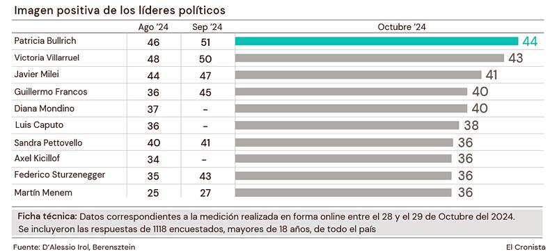 Aunque la ministra de Seguridad, Patricia Bullrich, mantiene la mayor imagen positiva (44%), por encima de la vicepresidenta Victoria Villarruel (42%), Milei (41%), el jefe de Gabinete Guillermo Francos (40%), la ahora ex canciller Diana Mondino (40%) y el titular de Economía, Luis Caputo (38%).