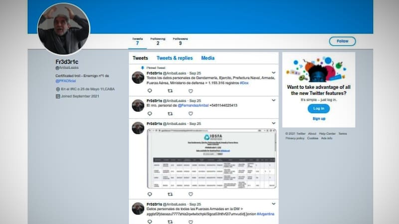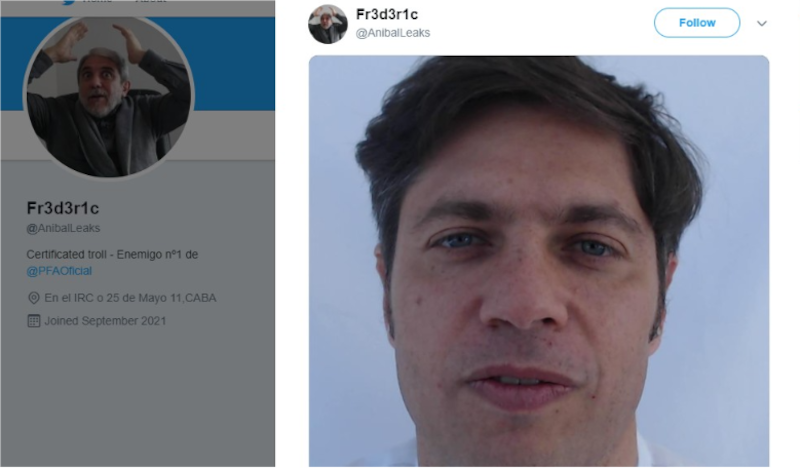 "Fr3d3r1c @AnibalLeaks Certificated troll - Enemigo nº1 de @PFAOficial ", detalla la caja de biografía del hacker apuntado por el Renaper creado en septiembre de este año.