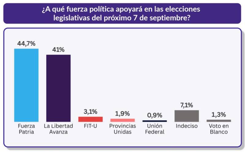 La última encuesta preelectoral muestra a Fuerza Patria encabezando la intención de voto con una ventaja de apenas 3,7 puntos sobre La Libertad Avanza.