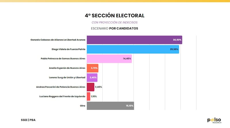 La 4° Sección, correspondiente al noroeste bonaerense, presenta otro escenario de paridad. Gonzalo Cabezas (LLA) lidera con 30,5%, seguido muy de cerca por Diego Videla (Fuerza Patria) con 29,5%. Pablo Petrecca (Somos Buenos Aires) alcanza un 14,4%, lo que lo convierte en un actor secundario de peso en la región.