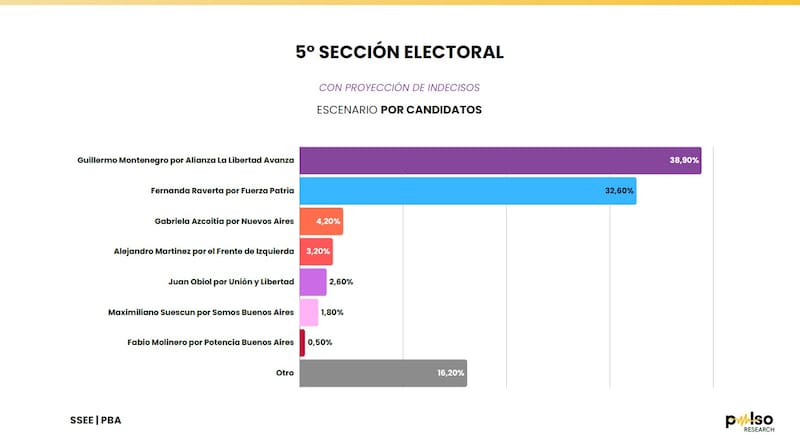 En la 5° Sección, que nuclea a los distritos de la costa atlántica y el centro-este, La Libertad Avanza se impone con amplitud. Guillermo Montenegro obtiene 38,9%, mientras que Fernanda Raverta (Fuerza Patria) queda en 32,6%. El resto de las fuerzas no logra superar el 5%. Este es uno de los enclaves más fuertes para el oficialismo libertario.