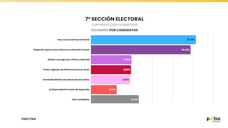 La 7° Sección, que corresponde al centro provincial, se mantiene en una disputa cerrada. Inés Laurini (Fuerza Patria) lidera con 25,7%, apenas por encima de Alejandro Speroni (LLA) con 24,4%. Otras fuerzas, como Unión y Libertad (9,9%), Potencia Buenos Aires (9,8%) y Somos Buenos Aires (9,6%), fragmentan la oferta, lo que genera un escenario de difícil proyección.