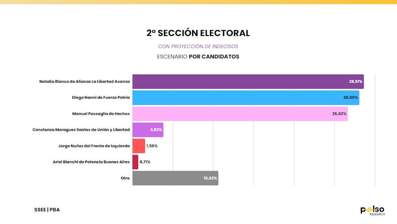 La 2° Sección, que abarca municipios del norte bonaerense, muestra un escenario mucho más fragmentado. Allí, Natalia Blanco (LLA) obtiene 28,6%, seguida muy de cerca por Diego Nanni (Fuerza Patria) con 28%. Sin embargo, sorprende la irrupción de Manuel Passaglia (Hechos), que se consolida con un 26,6%, lo que convierte a esta sección en un triángulo competitivo donde ninguna fuerza logra despegar con claridad.
