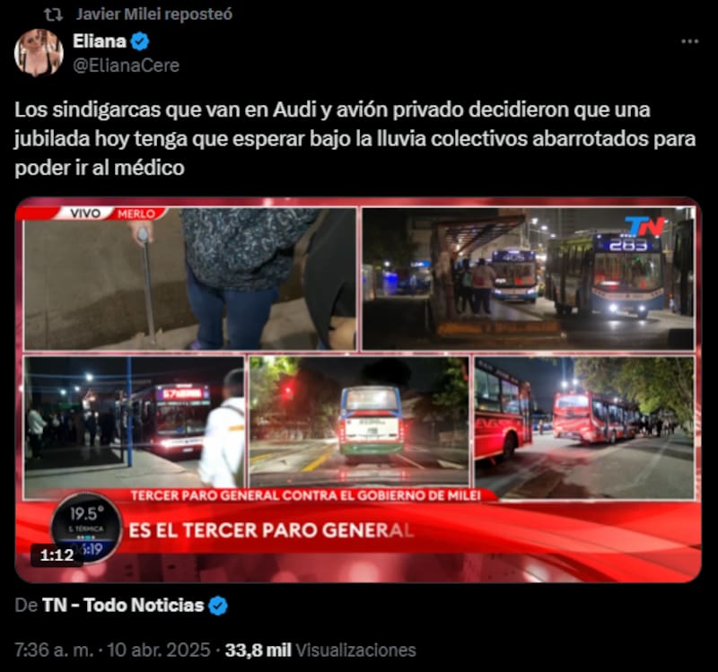 Otro de los reposteos fue a otra militante libertaria que escribió: "Los sindigarcas que van en Audi y avión privado decidieron que una jubilada hoy tenga que esperar bajo la lluvia colectivos abarrotados para poder ir al médico".