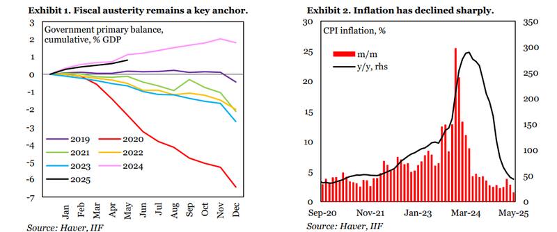• La inflación cayó al 40% desde más del 270% hace un año tras fuertes recortes del gasto real (~30%) y una política monetaria más restrictiva.