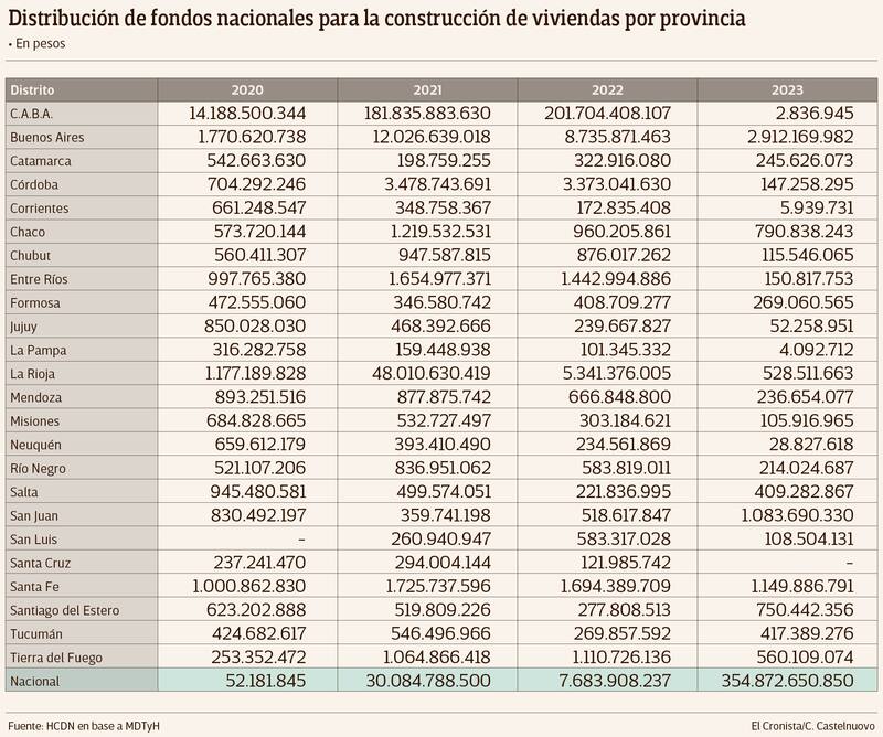 A la hora de definirse el reparto de obras de vivienda el Gobierno priorizó a las provincias del Norte. Según el último informe que elevó la Jefatura de Gabinete al Congreso se enviará a las provincias un total de $354.872.650 para la construcción de viviendas. En este caso, los distritos más beneficiados este año son la provincia de Buenos Aires ($2.912.169 millones), Santa Fe ($1.149.886 millones), San Juan ($1.083.690 millones), Chaco ($790.838 millones), Santiago del Estero ($750.442 millones), Formosa ($269.060 millones) y La Rioja (528.511 millones), entre otros.
