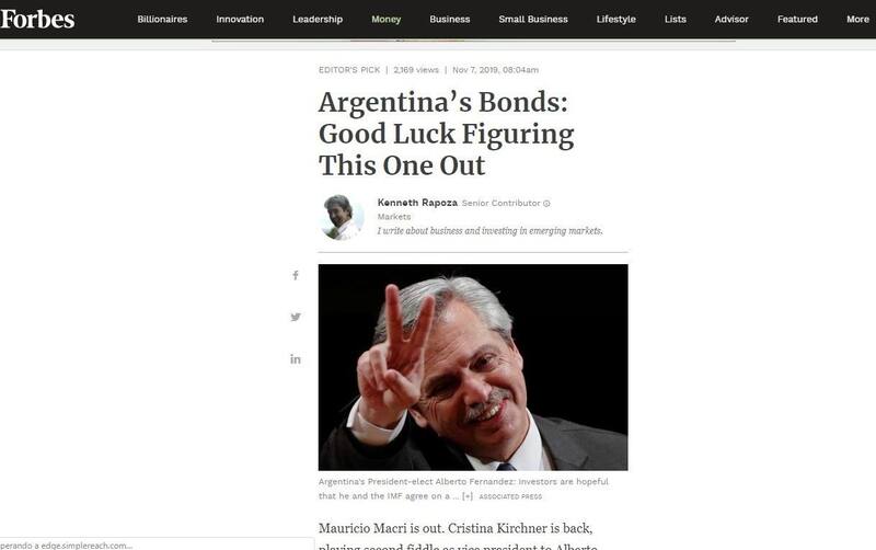 Finalmente, la nota de la revista Forbes se ocupa de los tenedores de bonos cuando remarca que "la Argentina no tiene ni 10.000 ni 20.000 millones de dólares y quien se los preste en estas circunstancias, lo hará por las tasas de interés escandalosas.