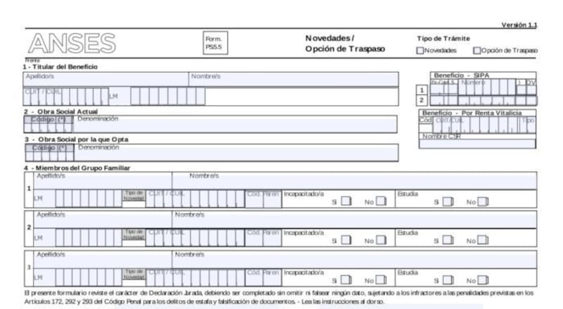 Quien quiera hacer el cambio de obra social debe buscar el formulario 5.5 que está disponible en la web o ingresando directamente en: www.anses.gob.ar/sites/default/files/formulario/2018-03/PS.5_5NovedadesOpcionTraspaso.pdf