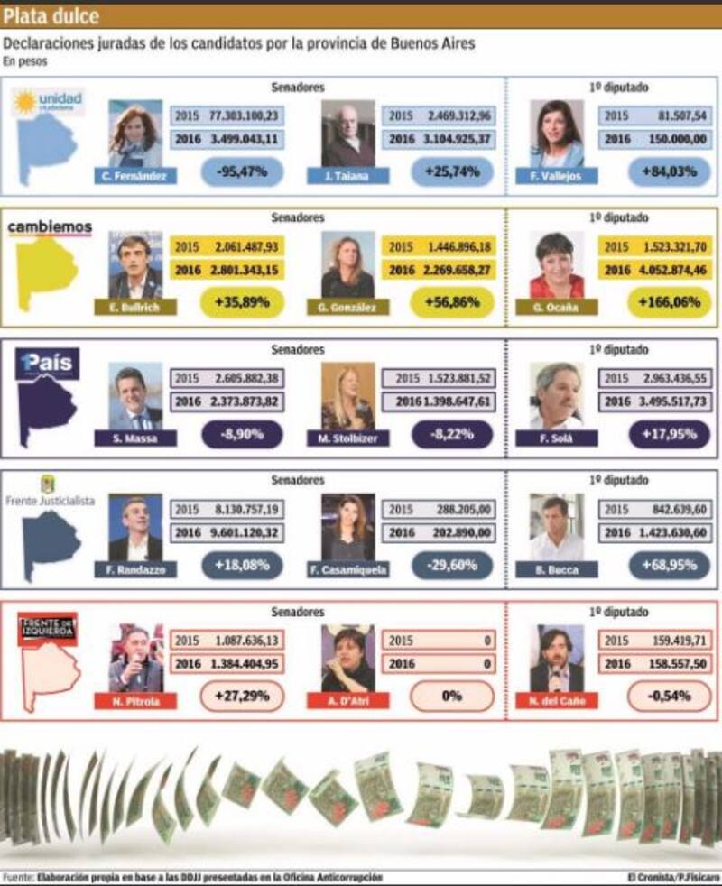 Más abajo aparecen los postulantes oficialistas a senadora, Gladys González con $ 2.269.658 y a diputado, Guillermo Montenegro con $ 2.158.669, quien en su paso por la embajada en Uruguay, experimentó el salto patrimonial más alto: un 227%. Debajo están Eduardo "Bali" Bucca (diputado por Cumplir) con $ 1.423.630; Stolbizer; Néstor Pitrola (FIT) con $ 1.384.404; Mirta Tundis (1País) con $ 1.275.769; Roberto Salvarezza (UC) con $ 1.238.495; Florencia Casamiquela (Cumplir) con $ 202.890; NIcolás del Caño (FIT) con $ 158.557; y, la más pobre, Fernanda Vallejos (UC) con $150.000.