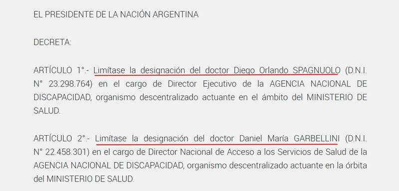 Con un comunicado difundido en la medianoche de ayer, la cuenta en redes de la Vocería Presidencial indicó que "frente a los hechos de público conocimiento y ante la evidente utilización política de la oposición en año electoral, el Presidente de la Nación ha decidido, de manera preventiva, la remoción del cargo del Director Ejecutivo de la Agencia Nacional de Discapacidad, Diego Spagnuolo".