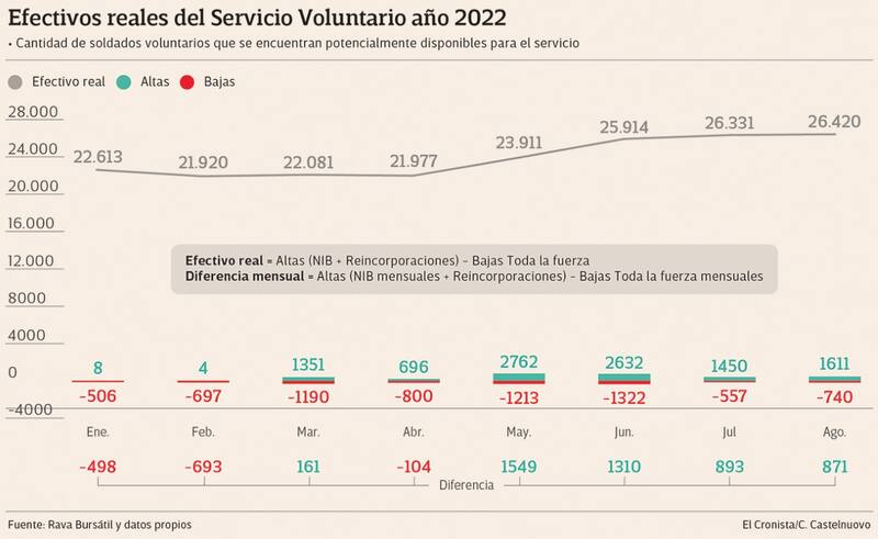 Así, durante 2022 se puso en marcha un plan para completar la estructura de soldados voluntarios y llevarlo, para el caso del Ejército, a 30.000 uniformados. Es decir llevar a un incremento del 33% el total de soldados.