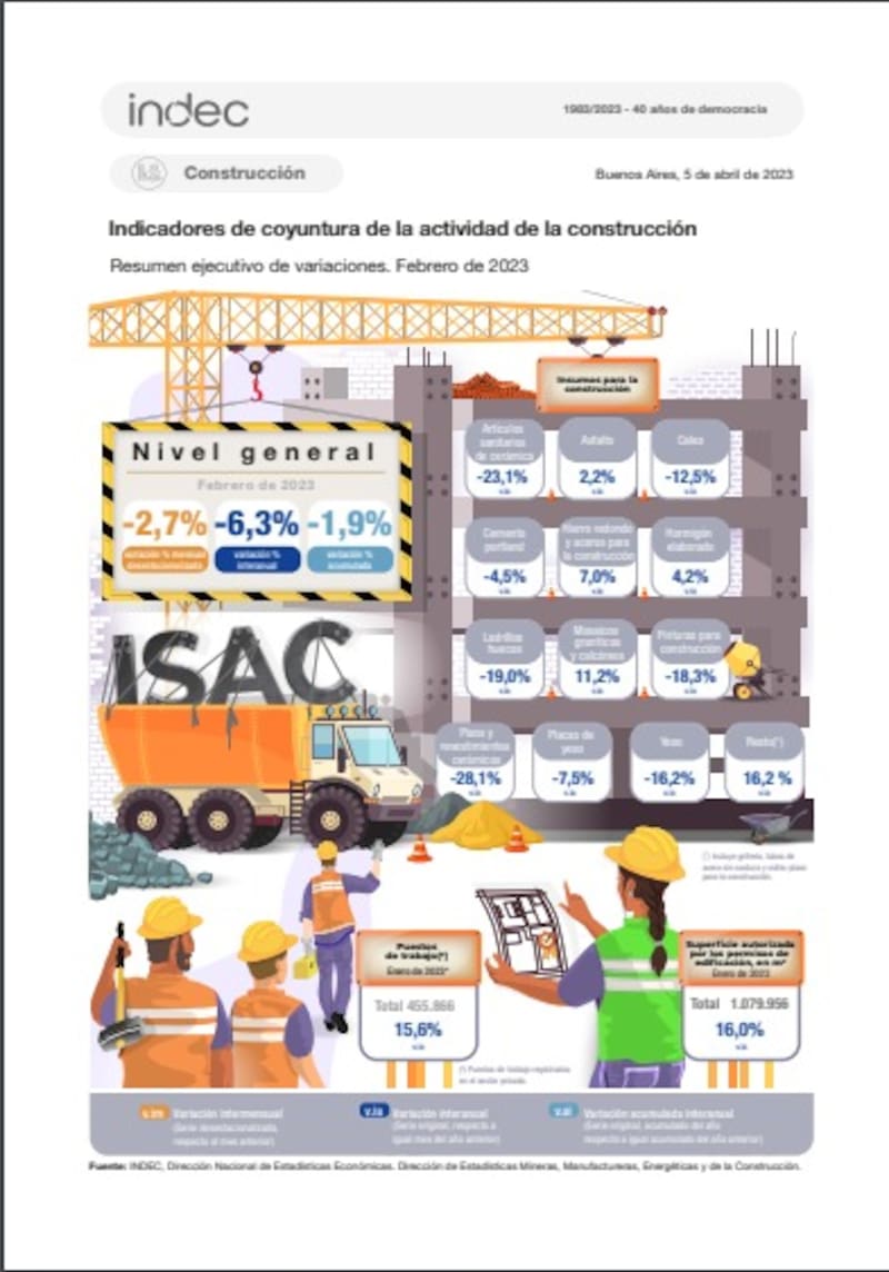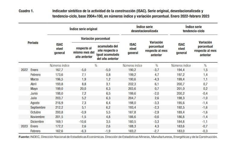 Según el INDEC, en febrero de 2023, el índice de la serie desestacionalizada muestra una variación negativa de 2,7% respecto al mes anterior y el índice serie tendencia-ciclo registra una variación negativa de 0,3% para la misma comparación.
