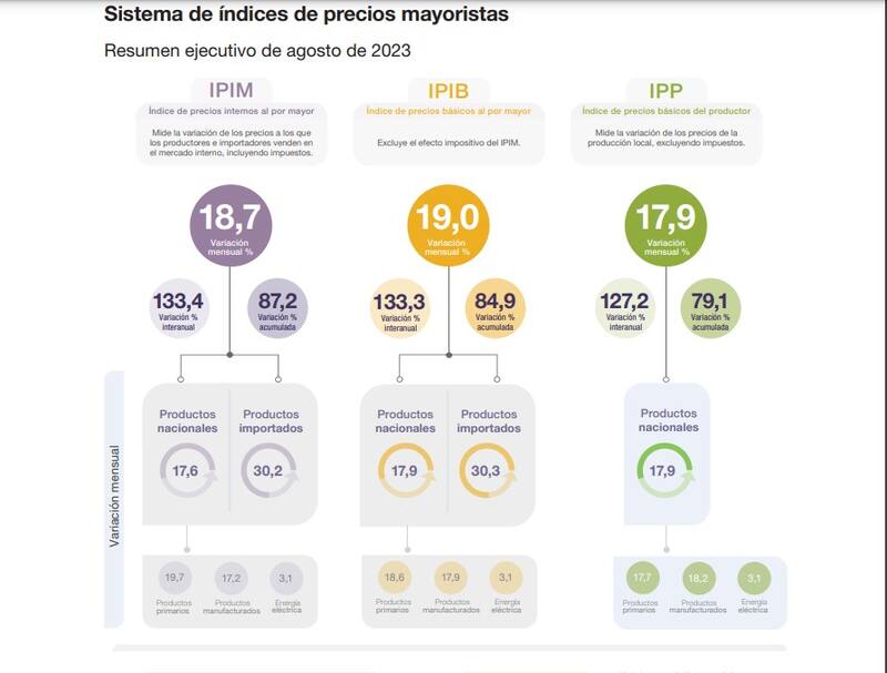 Por último, el Índice de Precios Básicos del Productor (IPP) experimentó un aumento del 17,9% en agosto de 2023. Este incremento se divide en un 17,7% en los "Productos primarios" y un 18,0% en los "Productos manufacturados y energía eléctrica".