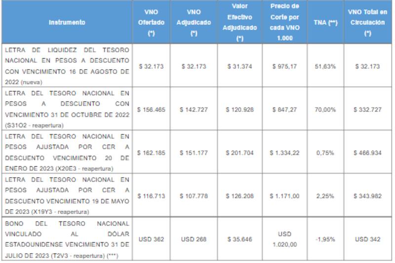 El 85% del valor de las operaciones provino de ofertas del sector privado. El costo que pagará el Tesoro por la letra a descuento (Lede) con tasa fija que amortiza el 31 de octubre es del 70% nominal anual (TNA), y 90,3% efectiva (TEA). "Fue más una señal que una necesidad", detalló una fuente oficial consultada por El Cronista.