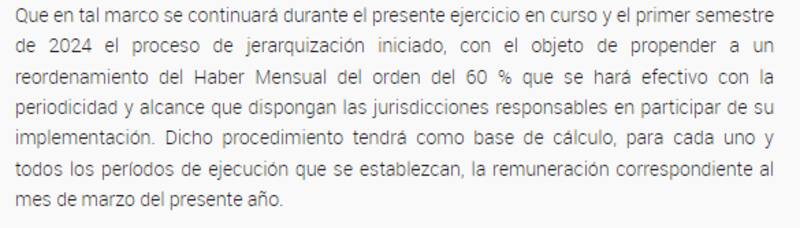 "El primer tramo del incremento será del 14% junto con el aumento de la pauta salarial de la Administración Pública Nacional, en julio se dará el segundo tramo con otro 14 % y en noviembre otro 12 % para culminar en 2023 con un 40 % de jerarquización del salario", detalló el funcionario en conferencia de prensa. Luego, en 2024 están previstos dos aumentos más del 10 % cada uno, a cobrarse en enero y en abril.