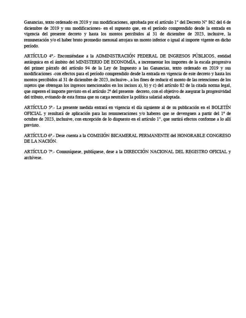 El artículo 4º del decreto encomienda a la Administración Federal de Ingresos Públicos (AFIP) la tarea de ajustar los importes de la escala progresiva del Impuesto a las Ganancias. El texto señala: "Encomiéndase a la ADMINISTRACIÓN FEDERAL DE INGRESOS PÚBLICOS, entidad autárquica en el ámbito del MINISTERIO DE ECONOMÍA, a incrementar los importes de la escala progresiva del primer párrafo del artículo 94 de la Ley de Impuesto a las Ganancias, texto ordenado en 2019 y sus modificaciones -con efectos para el período comprendido desde la entrada en vigencia de este decreto y hasta los montos percibidos al 31 de diciembre de 2023, inclusive-."
