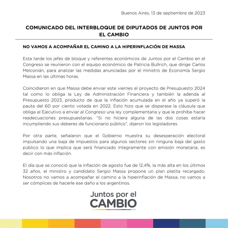 "El día que se conoció que la inflación de agosto fue de 12,4%, la más alta en los últimos 32 años, el ministro y candidato Sergio Massa propone un plan platita recargado. Nosotros no vamos a acompañar el camino a la hiperinflación de Massa, no vamos a ser cómplices de hacerle ese daño a los argentinos", explicaron en un comunicado de prensa.