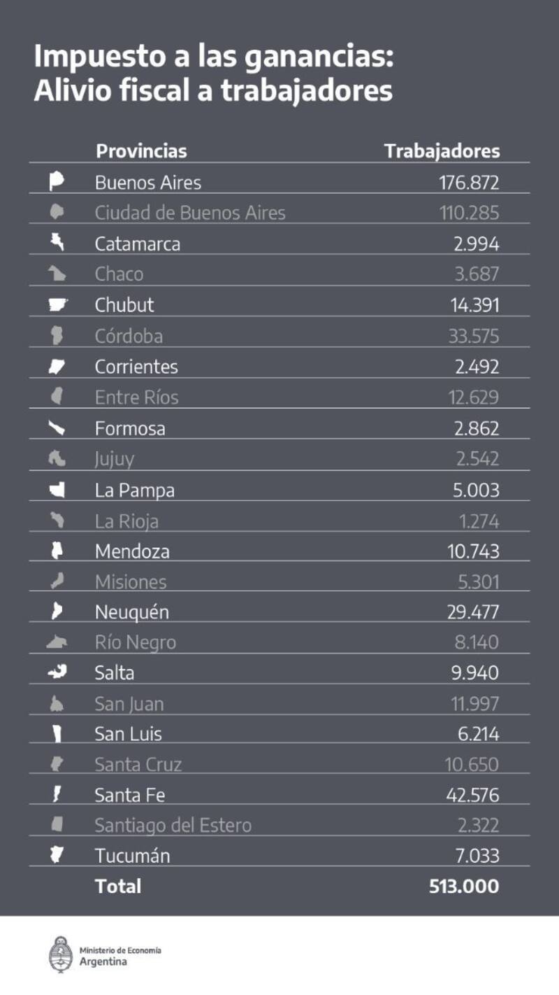 En total, esta medida beneficiará a 513.000 trabajadores a nivel nacional con salarios brutos mensuales de entre $ 506.230 y $ 880.000, actualmente sujetos al pago de Ganancias.