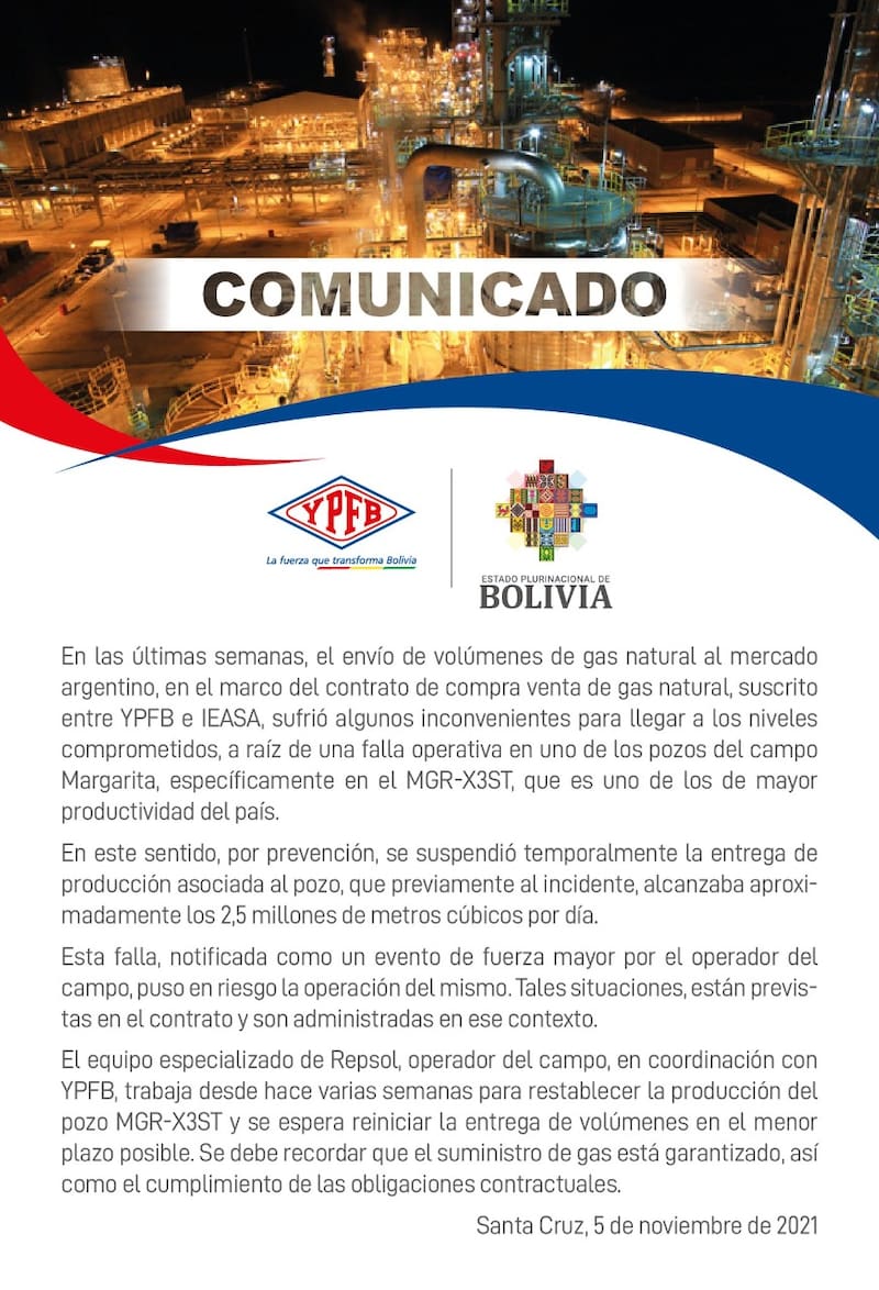 La petrolera de bandera boliviana informó que sufrió junto a Repsol una falla operativa en uno de los pozos del campo Margarita y lo catalogó como un "evento de fuerza mayor", por lo que estaría a salvo de una multa.