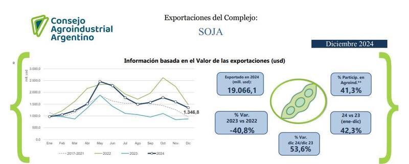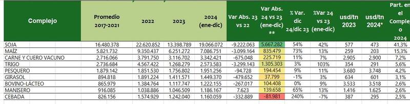 En el año 2024, sobre un total de u$s 46171, el aumento acumulado interanual es de u$s 9637 millones, lo que representa un incremento del 26% en relación al año anterior según el informe del Consejo Agroindustrial Argentino (CAA).