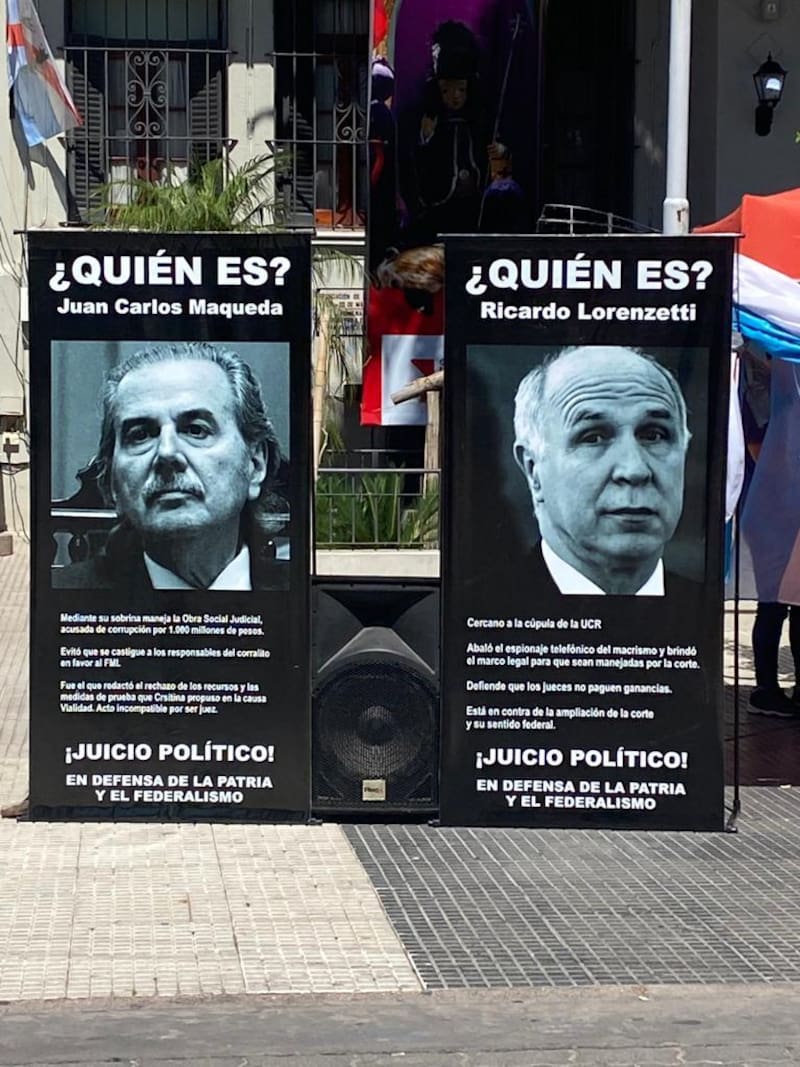 Las gigantografías piden, además, el juicio político para los cuatro magistrados y rematan con la frase: "En defensa de la Patria y el Federalismo". Los cuatro carteles incluyen un breve resumen de cada uno de los ministros del Máximo Tribunal.