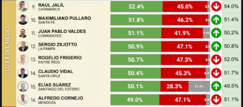En la franja intermedia del ranking aparecen figuras con evaluaciones más moderadas y, en varios casos, con caídas respecto de la medición previa. Raúl Jalíl en Catamarca y Maximiliano Pullaro en Santa Fe registran el 52,4% y el 51,8% respectivamente, con el santafesino mostrando una leve recuperación.