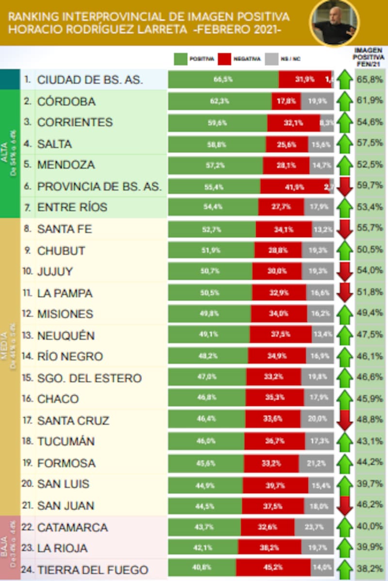 En tanto, el alcalde porteño Horacio Rodríguez Larreta, quien suena como uno de los posibles candidatos a presidente de cara a las elecciones de 2023, posee su imagen positiva más alta en la ciudad que él mismo gobierna, CABA, con 66,5% y su imagen positiva más baja en Tierra del Fuego, donde cosechó 40,8%.