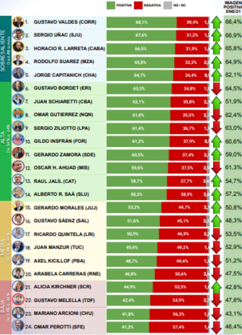 Cinco gobernadores mantuvieron en febrero una imagen positiva sobresaliente en sus provincias de acuerdo a una encuesta elaborada por la consultora CB. Ellos son Valdés (68,1%), Uñac (67,6%), Rodríguez Larreta (66,5%), además del mendocino Rodolfo Suárez (65,8%) y el chaqueño Jorge Capitanich (64,7%).