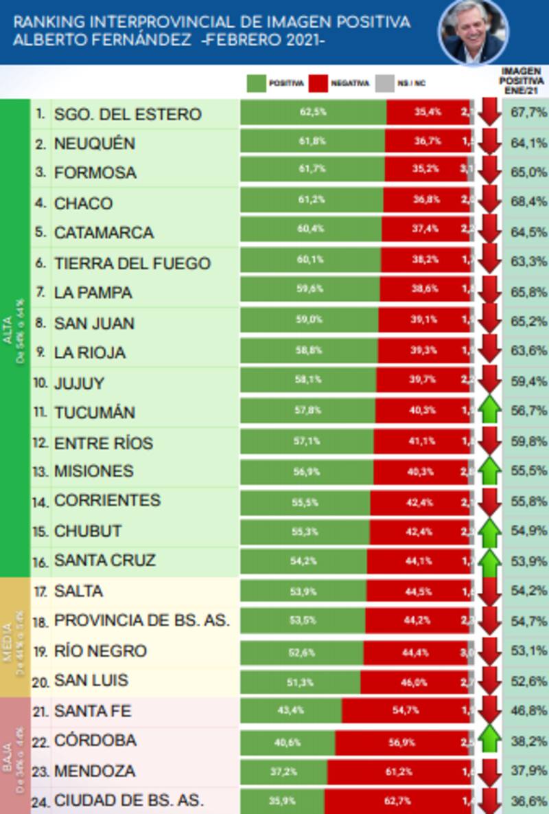 Asimismo, de acuerdo al relevamiento, el distrito donde más aumentó su imagen positiva con respecto al mes anterior fue Córdoba (+ 2,4 puntos), mientras que en Chaco fue donde más bajó su imagen con respecto a enero 2021 (- 7,2 puntos).