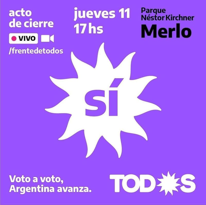 El acto de cierre de campaña del oficialismo en el Parque Municipal Néstor Kirchner, de la localidad de Merlo, donde en 2019 aparecieron en público, por primera vez, Fernández y su mentora y compañera de fórmula, Cristina Kirchner, se había planificado con la presencia de gobernadores y dirigentes de todo el país.