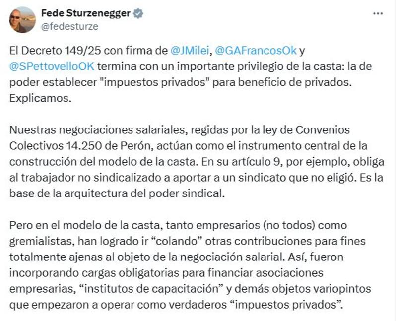 El ministro se explayó en un posteo en X horas después de haberse publicado la disposición. "Nuestras negociaciones salariales, regidas por la ley de Convenios Colectivos 14.250 de Perón, actúan como el instrumento central de la construcción del modelo de la casta. En su artículo 9, por ejemplo, obliga al trabajador no sindicalizado a aportar a un sindicato que no eligió. Es la base de la arquitectura del poder sindical", aseguró.