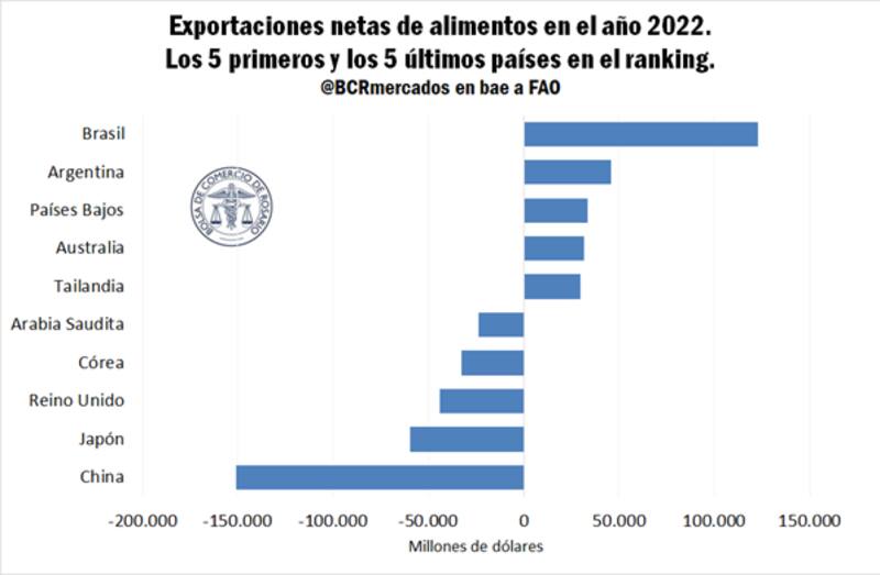 En dólares, en el 2022, Argentina se posicionó en segundo lugar en el ranking de exportadores netos de alimentos. Con un total de u$s 45.787 millones, el país quedó sólo por detrás del vecino Brasil, que alcanzó u$s 123.130 millones.