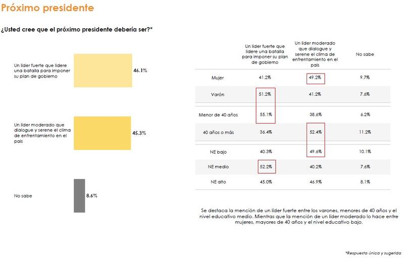 Según la encuesta, las alternativas están muy divididas. El 46% considera que el próximo Presidente debería ser "un líder fuerte que lidere una batalla para imponer su plan de gobierno". Del otro lado, el 45% apuesta a que quien asuma en diciembre de 2023 sea un "líder moderado que dialogue y serene el clima de enfrentamiento en el país". Las mujeres, los mayores de 40 años y los que tienen un nivel socioeconómico bajo son quienes más se vuelcan por esta última opción.