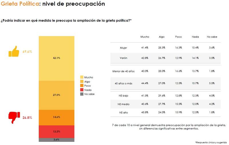 A la mayoría, el 70%, la grieta le preocupa "algo" o "mucho", mientras que el 15% contestó que le preocupa "poco". Solo un 12% aseguró que no le preocupa "nada" esta cuestión.