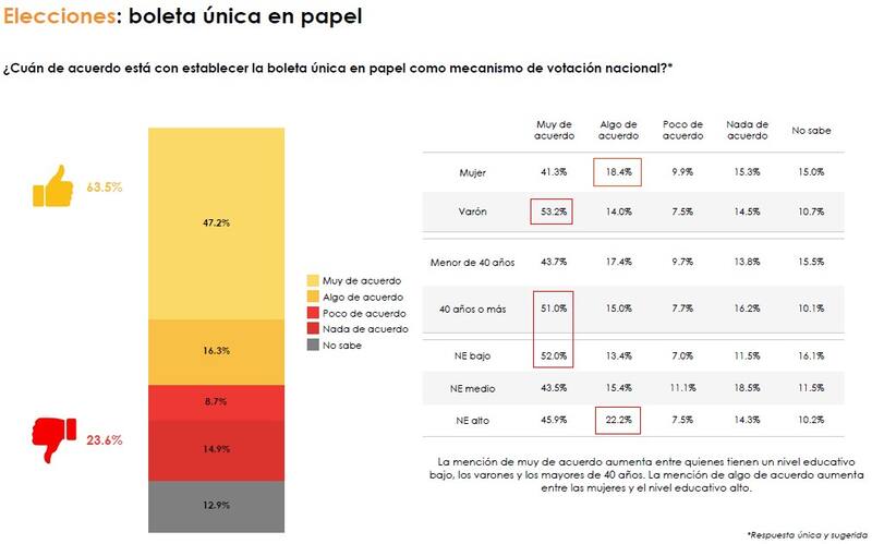 En primer lugar, el relevamiento se enfocó en un tema de actualidad, la boleta única papel. El proyecto para implementar esta reforma fue aprobado en Diputados y pasó al Senado. Casi dos de cada tres de los consultados se mostró a favor de la implementación de este instrumento de votación. A contramano, casi uno de cada cuatro se mostró en contra, lo que da cuenta de que existe cierto consenso respecto al proyecto.