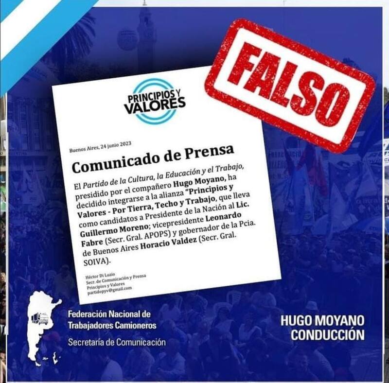 Luego de que el comunicado se difundiera a través de las redes sociales del partido de Moreno, Principios y Valores, desde las redes sociales del gremio de Camioneros desmintieron el tema. No obstante, no respondieron aún a los llamados de este medio para profundizar en la información.