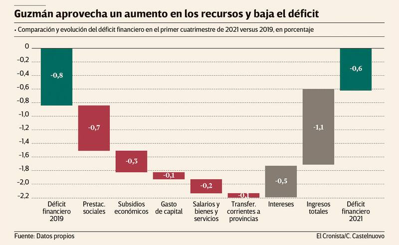 Si bien el déficit primario de 2021 se redujo en 0,2 puntos porcentuales respecto al 0,8% del primer cuatrimestre de 2019, "esto sucedió mientras el gasto primario registró un incremento de 1,4 puntos", por Prestaciones Sociales (0,7), Subsidios (0,3), Gasto de capital (0,1), Salarios (0,2) y Transferencias corrientes a provincias (0,1), informaron en el Gobierno.