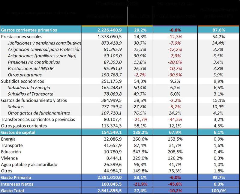 Nadín Argañaraz, del Instituto Argentino de Análisis Fiscal (Iaraf) planteó que en el primer cuatrimestre de 2021 un aumento real en los rubros gastos de capital, subsidios económicos y otros gastos de funcionamiento (los cuales representan, en conjunto, el 20,2% del gasto total), mientras que las prestaciones sociales (que tienen por sí solas una participación del 54,2% en el gasto total), salarios, transferencias corrientes a provincias y, especialmente, el pago de intereses presentaron una caída real.