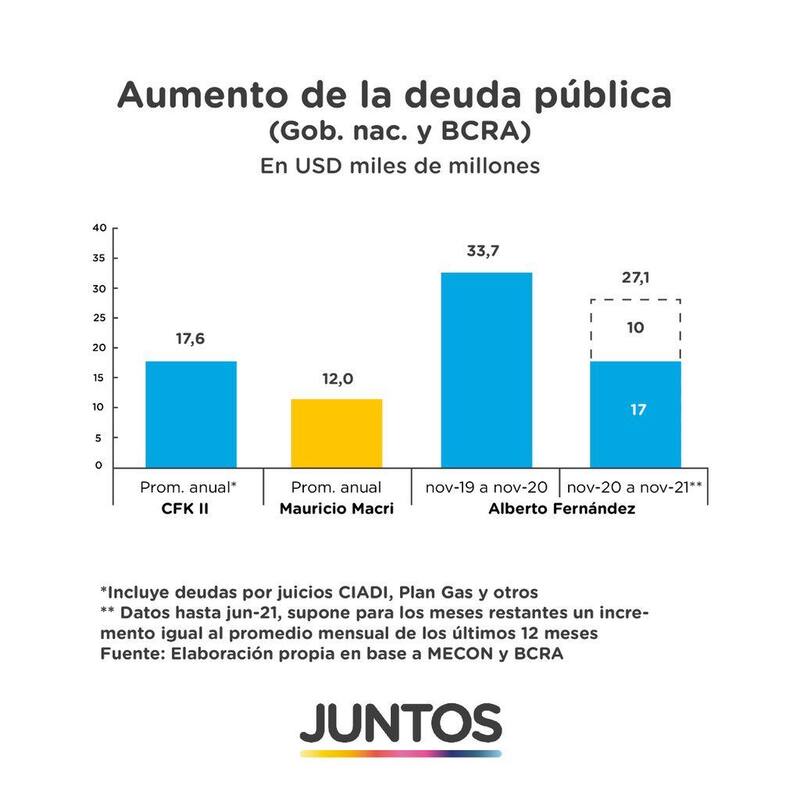 De acuerdo a los números que mostró el fundador del PRO, durante la gestión del Frente de Todos, el endeudamiento anual, en promedio, es de u$s 30.000 millones, cuando durante la gestión cambiemita fue de u$s 12.000.Esos $ 30.000 millones incluye la deuda cuasifical, es decir, pases y leliqs que el BCRA emite para esterilizar emisión.