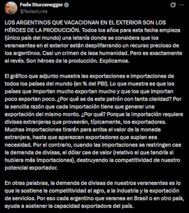 En un extenso posteo, Sturzenegger cuestionó que “todos los años para esta fecha empieza (único país del mundo) una letanía donde se considera que los veraneantes en el exterior están despilfarrando un recurso precioso de los argentinos”, indicando que se trata “casi un crimen de lesa humanidad”.
