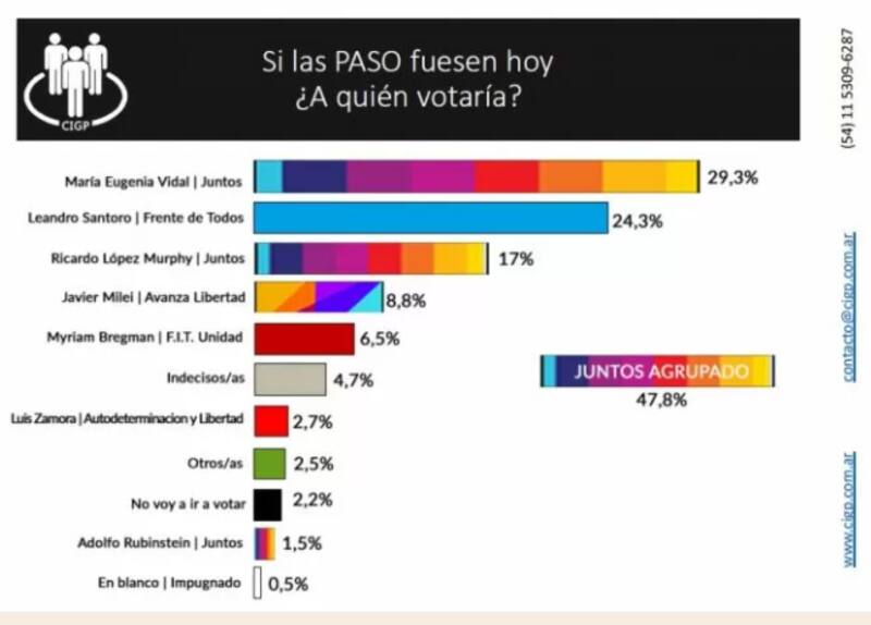 María Eugenia Vidal aparece en primer lugar, con el 29,3%. Con 17 puntos aparece Ricardo López Muprhy y con 1,5%, Adolfo Rubinstein.