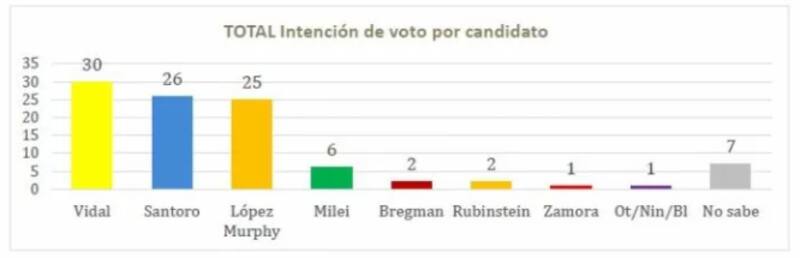 Cuando se consulta por candidatos, María Eugenia Vidal se ubica en el primer lugar, con un 30%. Dentro de su interna, saca una ventaja de 5 puntos ante Ricardo López Murphy, algo inferior a las aspiraciones de la ex gobernadora bonaerense. La lista de Adolfo Rubinstein aparece más relegada, con 2%.