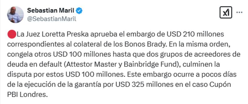 "La jueza Loretta Preska aprueba el embargo de u$s 210 millones correspondientes al colateral de los Bonos Brady. En la misma orden, congela otros u$s 100 millones hasta que dos grupos de acreedores de deuda en default (Attestor Master y Bainbridge Fund), culminen la disputa por estos u$s 100 millones", explicó Sebastián Maril, consultor de Latam Advisors y especialista en los juicios que la Argentina enfrenta en el exterior, en su cuenta de X.