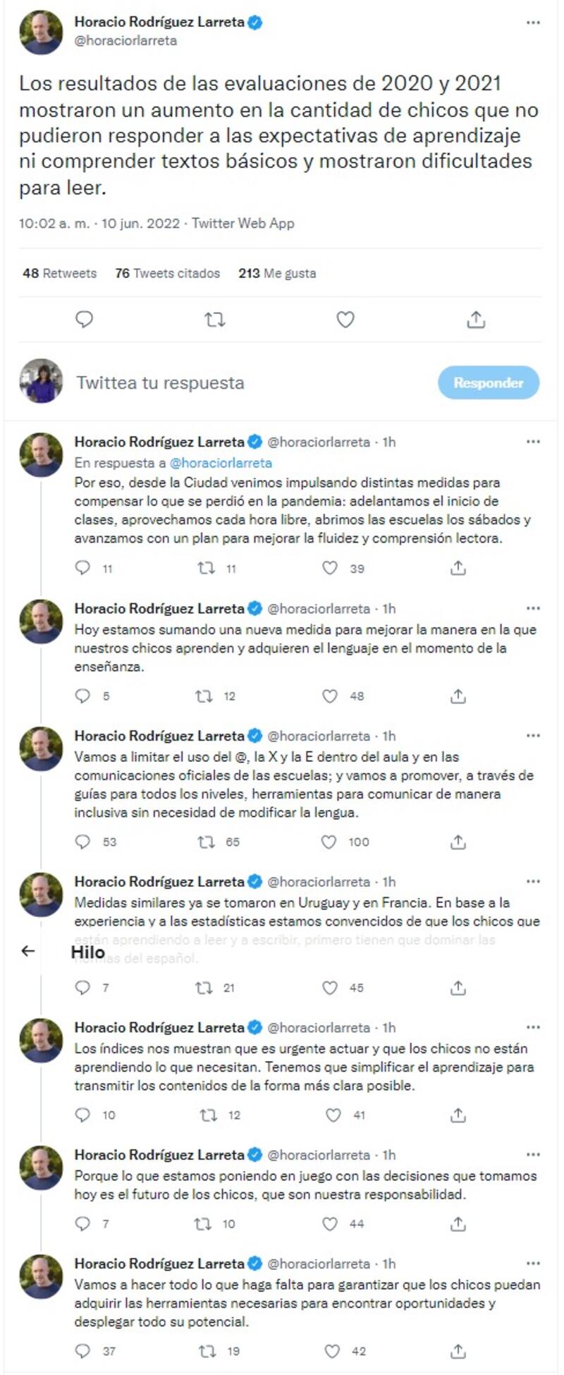 "En la escuela hay que respetar el idioma español porque los índices muestran que es urgente: no podemos perder un día más", argumentó Rodríguez Larreta, en referencia a los resultados de las últimas evaluaciones de Lengua entre los estudiantes de la Ciudad, que mostraron un importante retroceso en esta área a raíz de la pandemia.